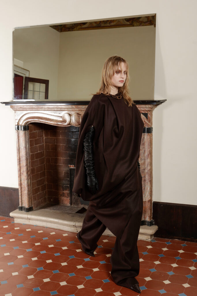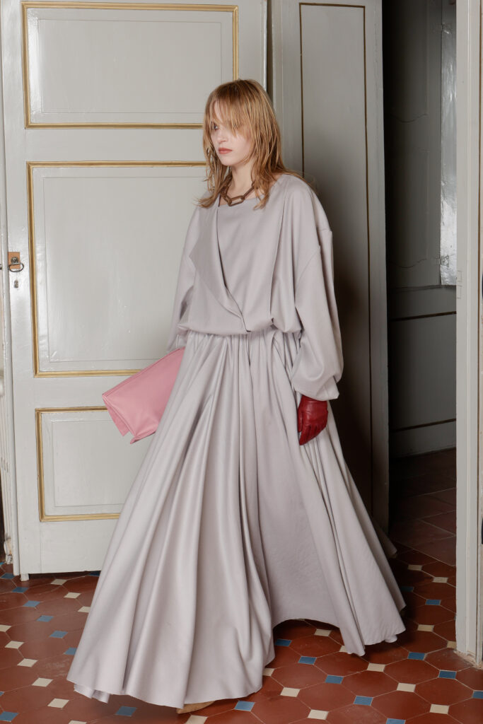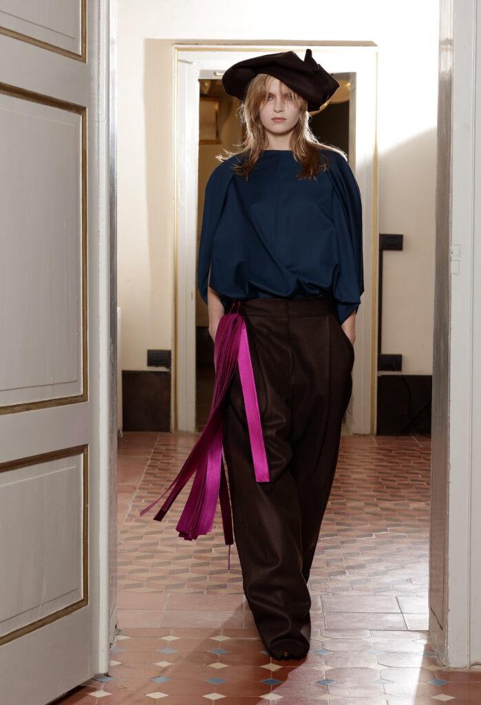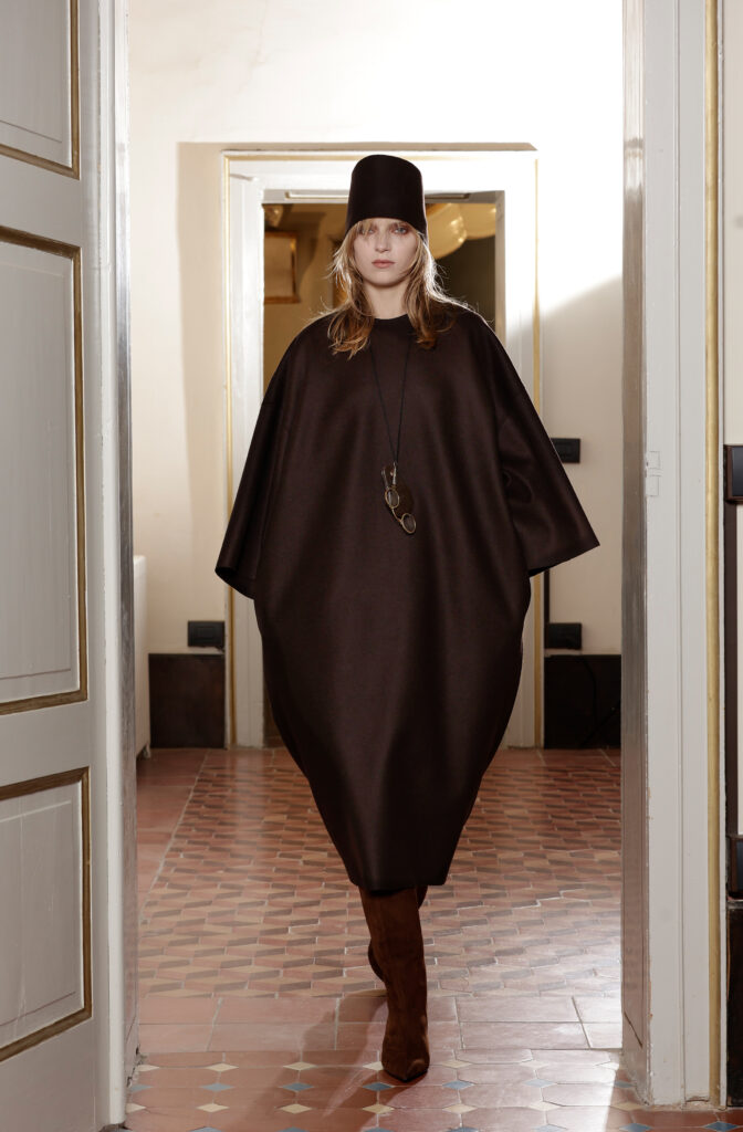 Le silhouette si articolano tra oversize draping, linee a scatola, tuniche e forme ad A, con accessori coerenti con il racconto: cappelli in panno, guanti in nappa, borse busta e sac à main in lana o gobelin.
