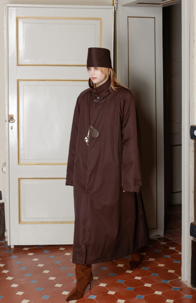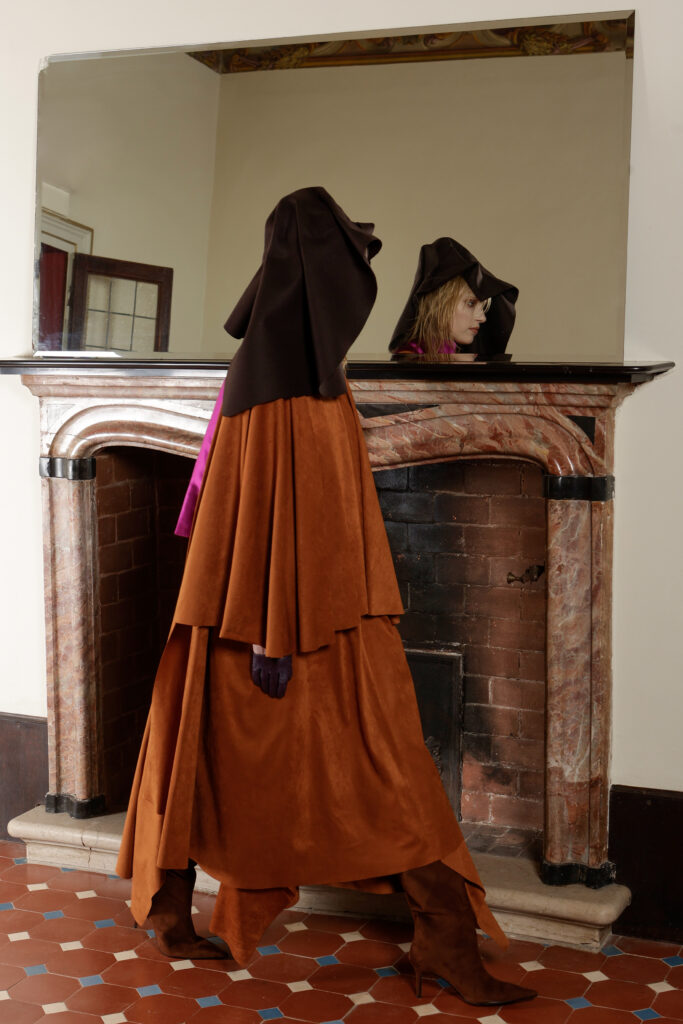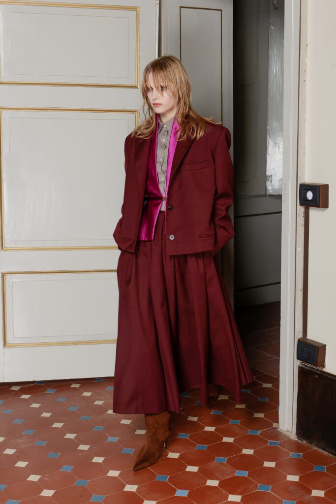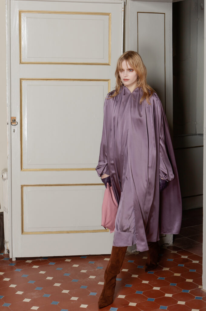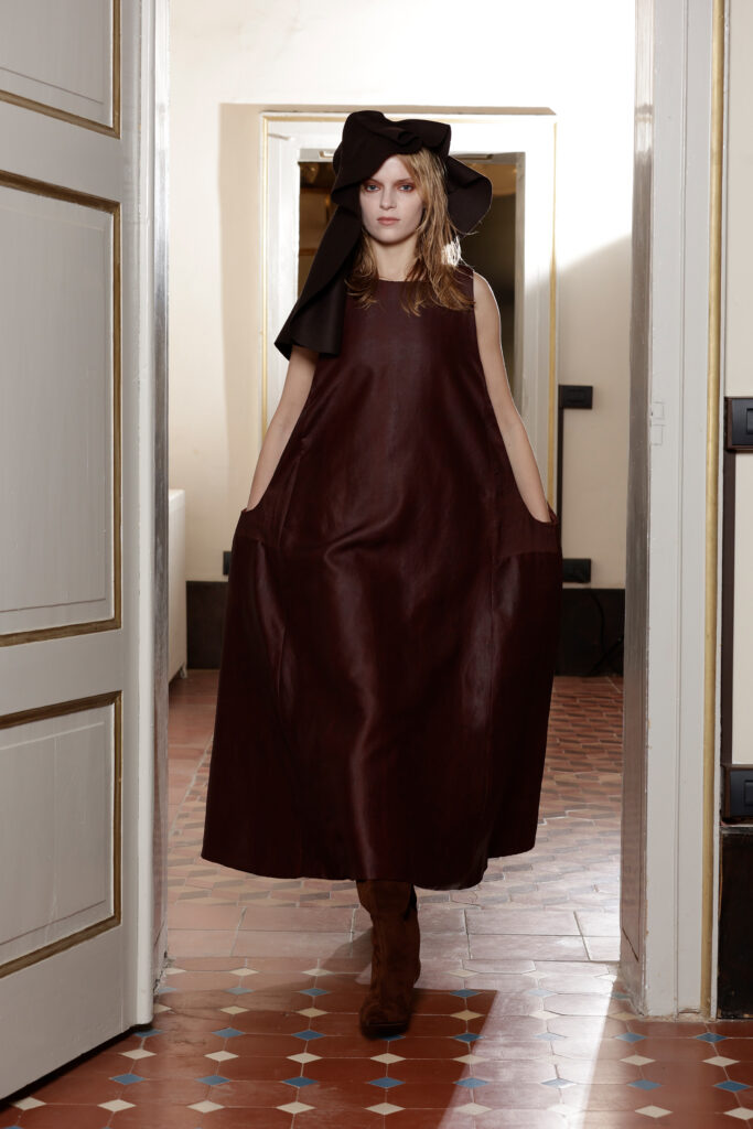 Le silhouette si articolano tra oversize draping, linee a scatola, tuniche e forme ad A, con accessori coerenti con il racconto: cappelli in panno, guanti in nappa, borse busta e sac à main in lana o gobelin.
