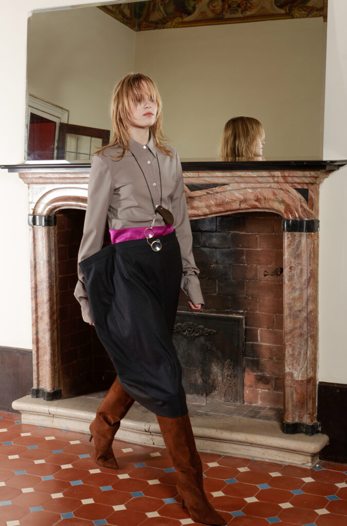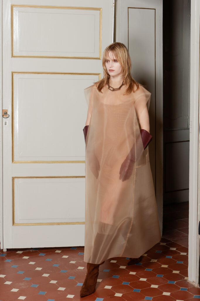 La struttura dei capi è guidata da un tracciato costruttivo preciso. Le proporzioni si moltiplicano come in uno specchio che riflette all’infinito, creando un gioco di simmetrie e prospettive successive. È una collezione che parla di spazio: porte che si aprono su altre stanze, finestre tagliate dalla luce, interni che dialogano con l’esterno.