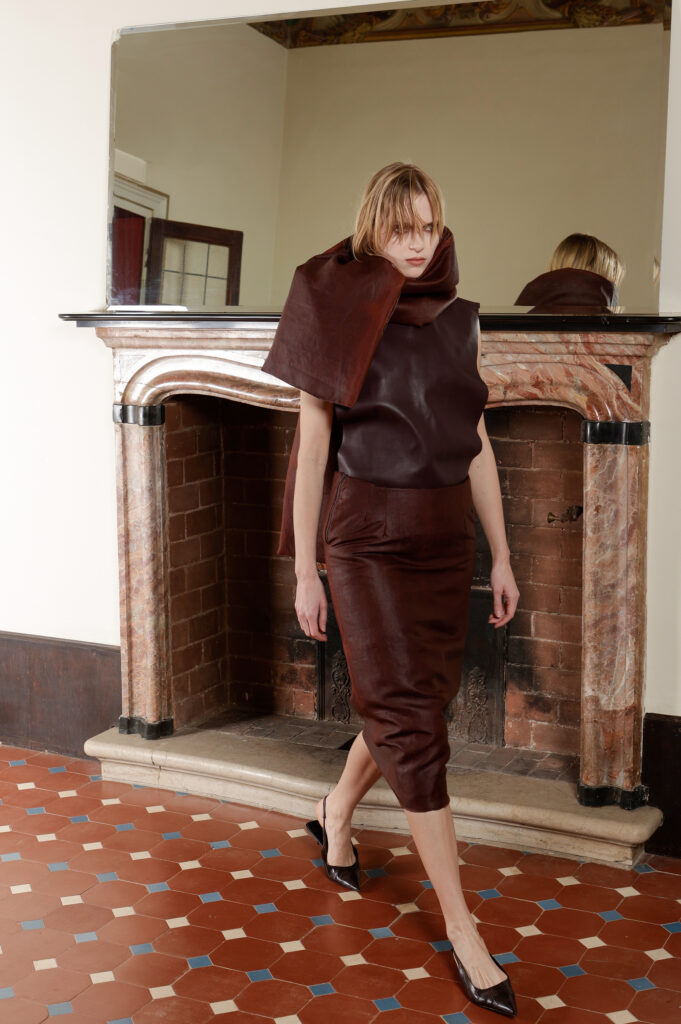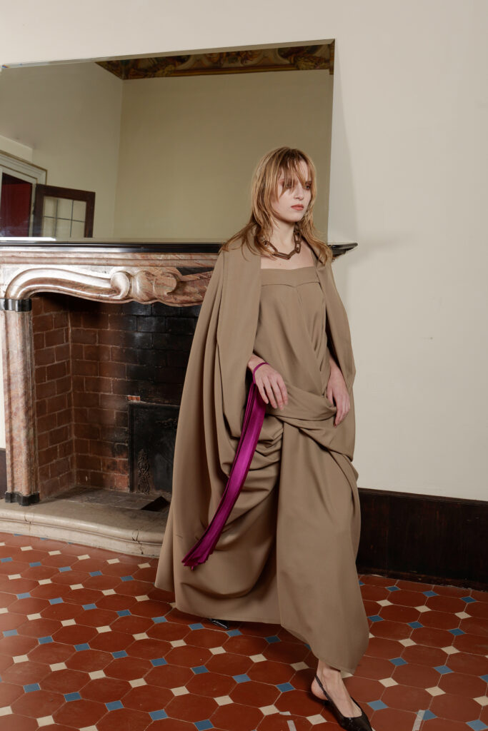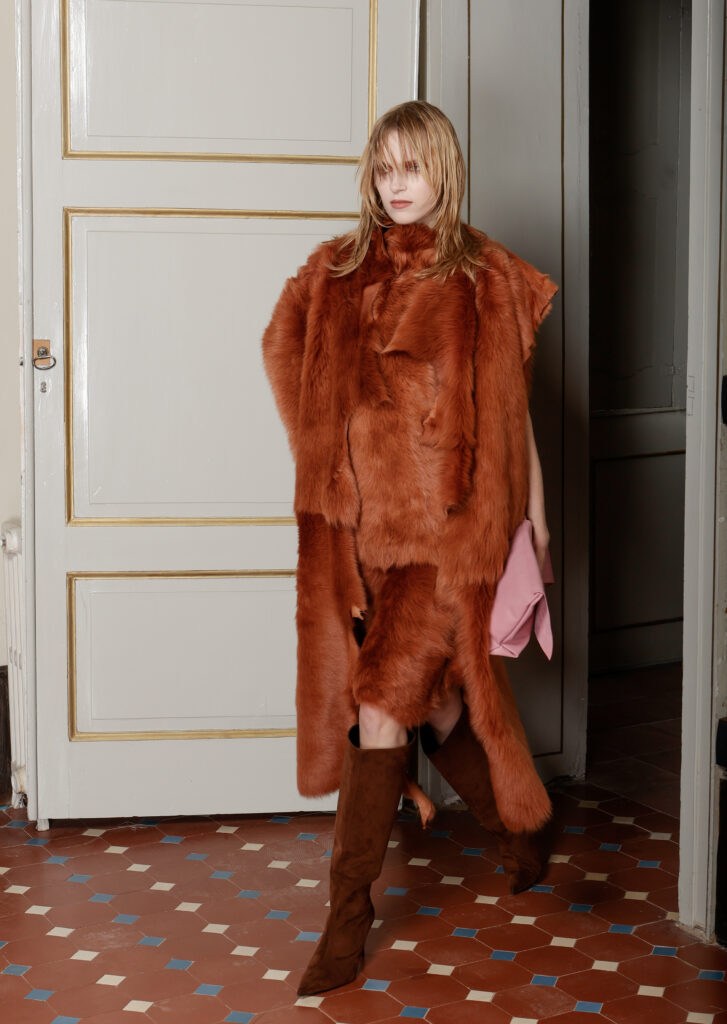 L’estetica minimalista delle grisaglie maschili si amplifica in gobelin decorativi, mentre la nappa pink-mauve e lo shearling caramello evocano una sensualità primitiva e materica. Le lane cashmere destrutturate dialogano con sete fluide, liberando le linee in un movimento che ricorda una danza controllata.