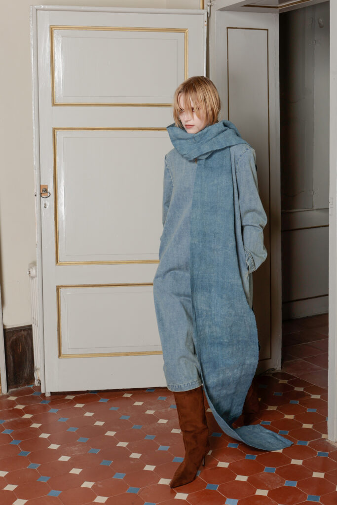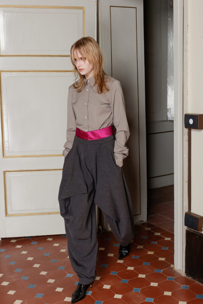 La sperimentazione materica è centrale. Come indicato nel materiale stampa , la collezione spazia dalla seta iromuji imbottita che avvolge in volumi rotondi, ai lini arcaici decostruiti in tuniche d’ispirazione samurai. Il panno tagliato al vivo prende forma in cappotti oversize, macro cappe e pantaloni balloon.