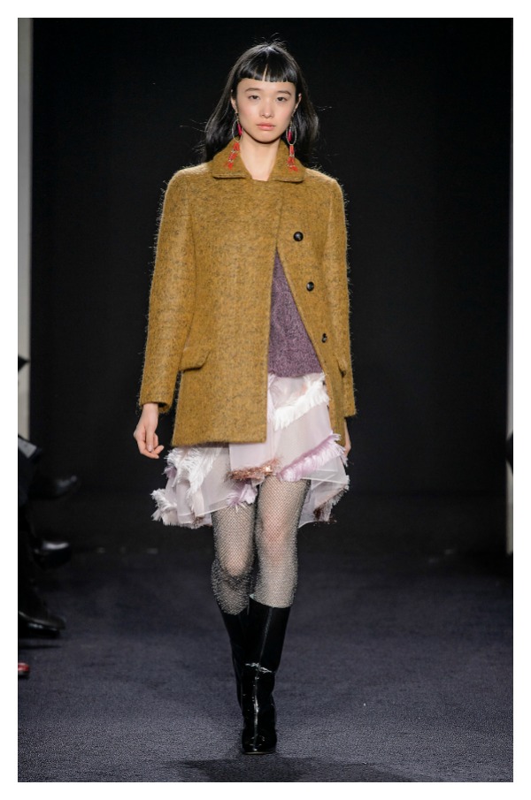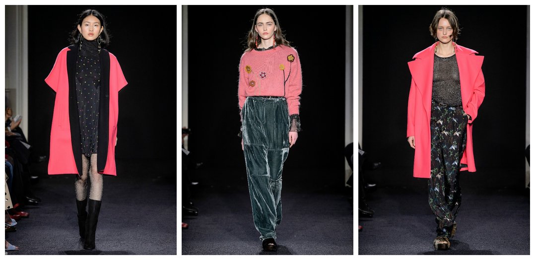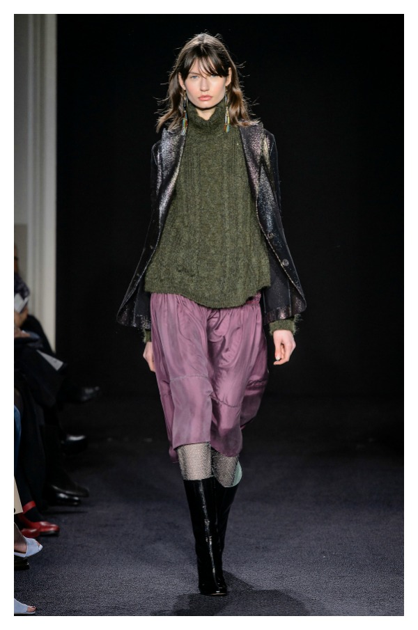 UNA DONNA ECLETTICA; l’atteggiamento è quello di cui sceglie ciò che le è affine e cerca di armonizzarlo in una nuova sintesi. Interpreta e sperimento, grazie a capi double, come le cappe in panno compatto: fluo e nero. Grazie ai passepartout di collezione-dolcevita, serafino, tute in costina di jersey, da mettere sotto le ampie scollature o gli abiti. Le camicie over spuntano da micro gonne di lana ricamata traforata, ma si usano anche semplicemente come abiti. Mentre le gonne longuette in tessuti pesanti di lana si possono mettere con sopra camicie chiuse o aperte, a segnare la scollatura. E ancora body iper femminili sopra pantaloni oversize dégagé in velluto, in lana e stampati, per avere un’aria più androgina.
